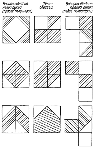 Рис. 16. Различие принципов зрительного восприятия правым и левым полушариями мозга. Средняя колонка — фигуры-образцы, предъявляемые испытуемым с функционально отключенным одним полушарием; левая колонка — фигуры, воспроизведенные испытуемыми с отключенным правым полушарием;