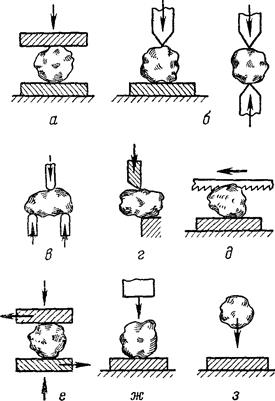 Измельчить твердый материал до частиц желаемого размера можно раздавливанием, раскалыванием, разламыванием, резанием, распиливанием, истиранием, ударом и различными комбинациями этих способов (рис. 3.1).