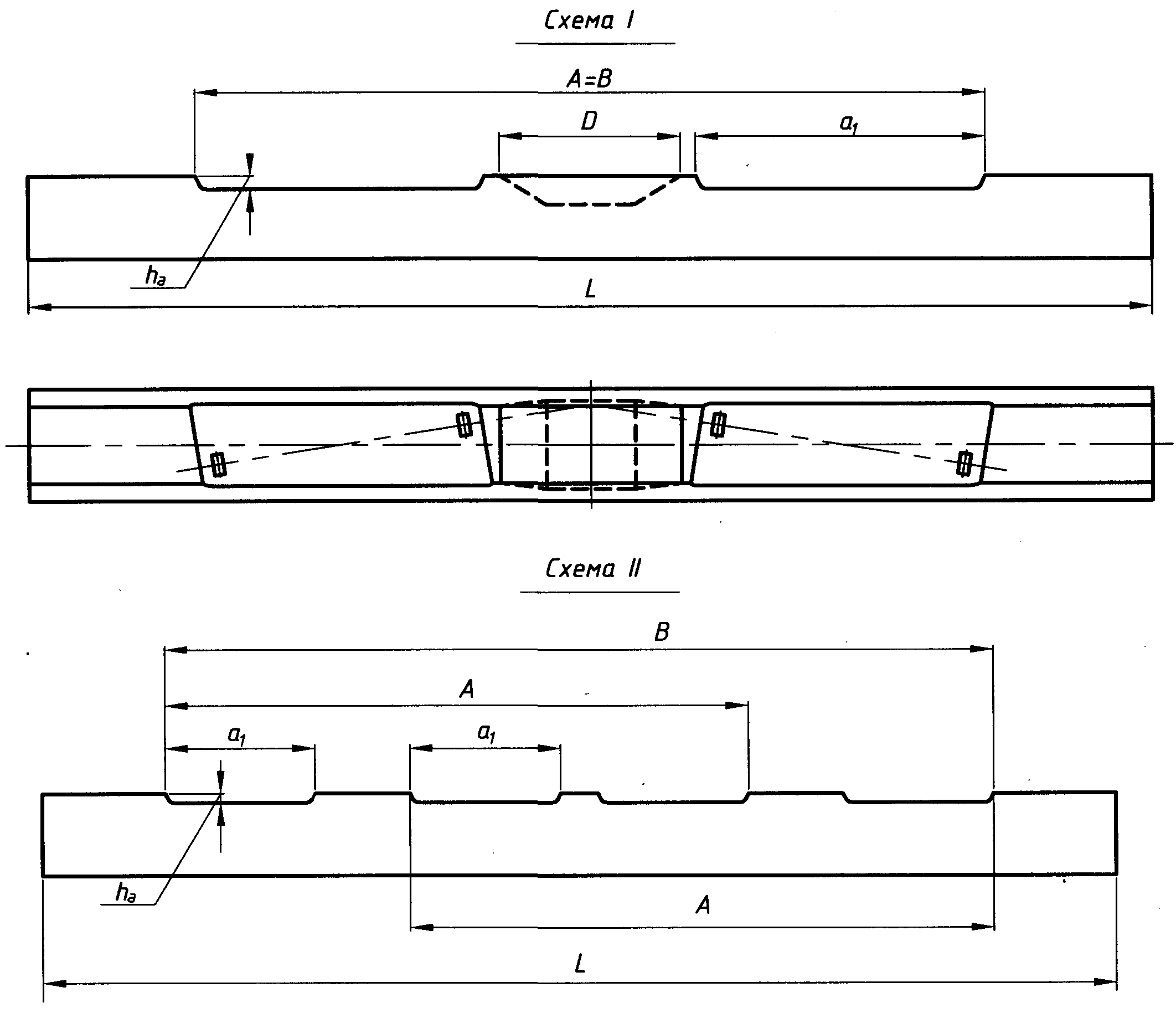 Рисунок П.5.8. Схемы I-II основных параметров железобетонных брусьев стрелочных переводов