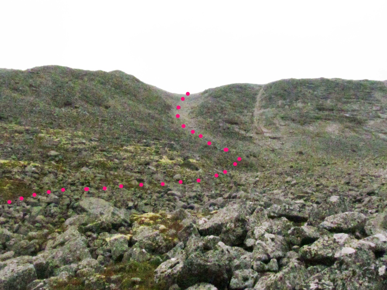 Подъем начинается с осыпного склона. Далее поднимаемся по сухому руслу (координаты начала русла N 67.73975̊ E 033.42399̊). Русло выводит практически к началу полки (при подъеме на перевал полка находится справа по ходу движения).