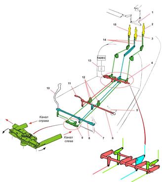 11 - Рычаг "шаг-газ" пилота-12-Точки реверсирования каналов циклического шага.