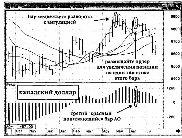 График канадского доллара, показанный на Рисунке 10.5, напоминает нам о необходимости следить и за бычьими, и за медвежьими барами разворота. В данном примере цена опять отходит под углом от Аллигатора (это видно с помощью треугольника на графике), и мы открываем короткую позицию, в то время как АО продолжает повышаться еще на протяжении двух баров. Обратите внимание, что сигнал продажи, подаваемый АО (третий понижающийся бар АО), произошел лишь через шесть баров после бара медвежьего разворота; не ожидайте, что он будет иметь место сразу же. Когда мы входим на рынок, используя сценарий бара медвежьего или бычьего разворота, мы ожидаем, что моментум вот-вот изменится, но нередко нам приходится ждать несколько баров, пока это произойдет.
