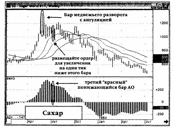 АО создает то, что обычно является нашим вторым входом в начавший развиваться тренд. Если предположить, что ранее был бар бычьего разворота, бесспорно находящийся ниже Аллигатора, и мы ввели сигнал покупки чуть выше бара бычьего разворота, у нас сейчас длинная позиция на рынке, и мы ищем место, где можно было бы эту первоначальную длинную позицию увеличить. Помните, что на баре бычьего разворота АО должен быть красного цвета (это указывает, что мы отрываем сделку против тренда), но когда моментум изменяется, что видно по окрашиванию АО в зеленый цвет (обычно он становится зеленым в пределах 2-4 баров после вашего входа), рынок оказывается готовым для увеличения позиции. Обычно мы добавляем после трех зеленых баров подряд. Мы размещаем покупающий стоп чуть выше максимума ценового бара, который соответствует третьему зеленому бару АО.