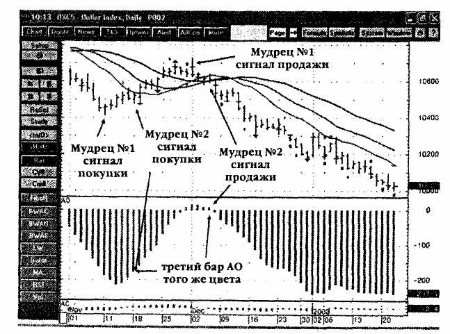 Рисунок 10.8 иллюстрирует, как мудрецы 1 и 2 на графике доллара показывают, где вам следует открывать длинную позицию в середине ноября, исходя из бара бычьего разворота (мудрец 1) и увеличивать ее после третьего зеленого (восходящего) бара на графике АО. Затем вы забираете прибыль и разворачиваетесь в нижнюю сторону, основываясь на баре медвежьего разворота 1 декабря. Затем вы увеличиваете свою короткую позицию 5 декабря и держите ее до конца этого графика, т.е. до конца января. Это хорошая иллюстрация того, как использование трех мудрецов позволяет вам оставаться в одном ритме с рынком, забирая прибыль и на повышающихся, и на понижающихся рынках. В Главе 11 мы проиллюстрируем, как и когда вам следует увеличивать свою позицию, основываясь на фрактальном прорыве, который и является сигналом нашего третьего мудреца. Если вас интересует больше примеров по этим сигналам, заходите на наш вебсайт www.profitunity.com, где вы увидите эти и другие графики в цвете.
