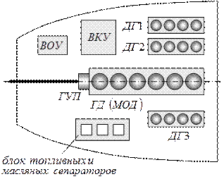 Рис. 37. Схема размещения оборудования в машинном отделения судна с МОД. |