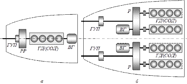 Пропульсивные установки с СОД и механическими передачами могут иметь разнообразное конструктивное исполнение: одномашинные – с одним ГД, подключенным к редуктору; двух-, трех- и четырехмашинные – с двумя, тремя или четырьмя двигателями, также подключенными к одному редуктору; одновальные и многовальные.