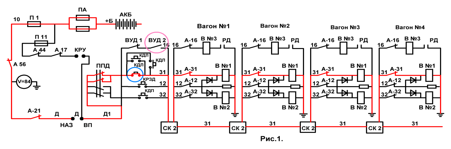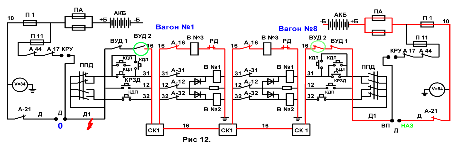 +Б, ПА, П1, 10-й поездной провод, А 21, провод ,,Д’’, кулачёк реверсора Д, провод ,,Д1’’, ППД, импульсная кнопка КДЛ, 31-й поездной провод, СК 2, и в каждом вагоне А-31, В №1 ,,земля ‘’.
