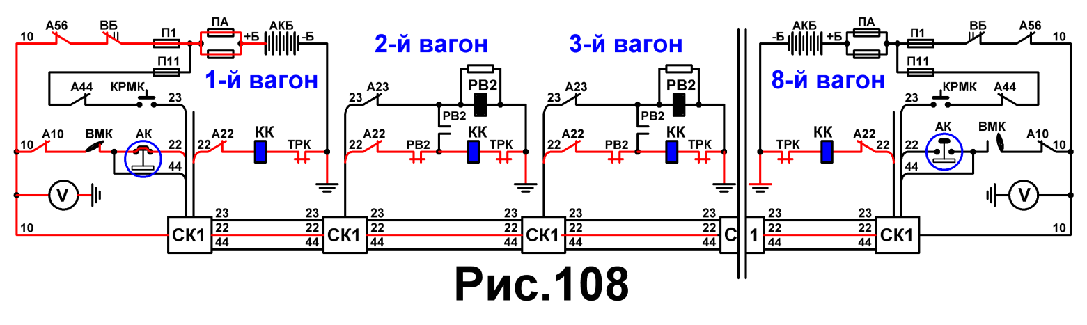 вагон, кроме головного и хвостового, А23, реле РВ2, ,,земля’’. (Рис.113)