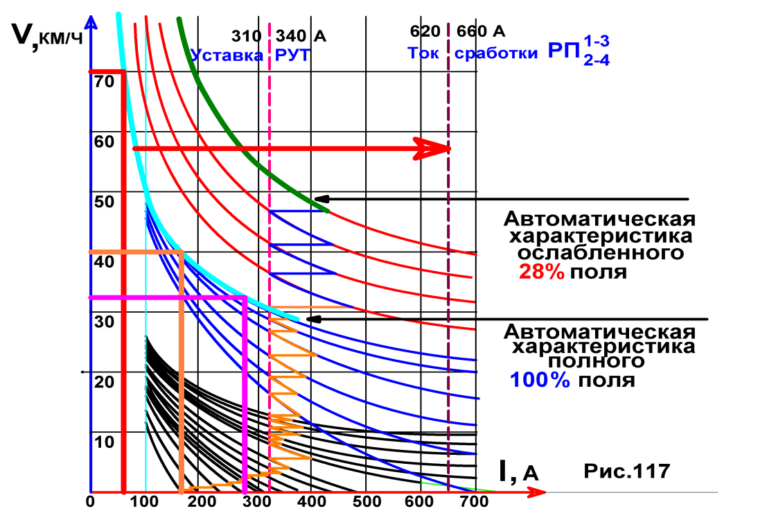 70 км/ч I= 70 А, красная линия.
