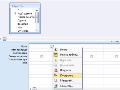 При создании выражений для таблиц, запросов и других объектов Access следует использовать построитель выражений. Для вызова построителя нужно сначала щелкнуть по ячейке, в которую будет вводиться выражение, а затем по кнопке Построить на панели инструментов или правой кнопкой мыши по раскрывающемуся списку ячейки (см. рис.5.1). На экране появится окно Построитель выражений (см. рис. 5.2), содержащее четыре поля.