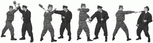 «Пять» - С коротким шагом правой ногой вперед выполнить удар прикладом сбоку.
