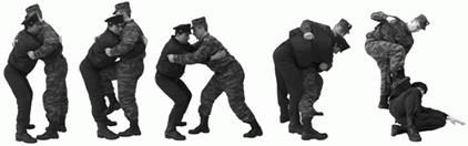 «Загиб руки за спину» – захватить рукой кисть руки противника, другой рукой – сверху одежду у локтя и нанести удар ногой; вывести противника из равновесия рывком на себя, согнуть его руку в локтевом суставе, а затем – перевести ее за спину; нанести удар ребром ладони по шее, захватить рукой за воротник (у плеча), волосы или каску, и удерживая болевым воздействием, конвоировать противника. Для связывания свалить противника на землю, сесть на него, нанести удар по голове, плотно прижать захваченную руку и провести загиб другой руки (рис. 50).
