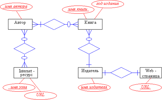 • - При анализе объекта "издатель" мы предположили, что сущность "web-страница" может быть объединена с сущностью "Internet-ресурс". Однако, мы видим, что эти сущности имеют разный набор атрибутов, следовательно выполнить такое объединение нельзя. Вспомним, что в противном случае, предполагалось единственный атрибут сущности "web - страница" присоединить к атрибутам сущности "издатель". Тем не менее, не будем этого делать, в следующем разделе мы увидим, что с помощью правил порождения реляционных отношений из модели "сущность-связь" в том и в другом случае мы получим одинаковый результат.
