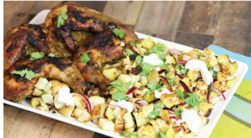 5. Разложите Алу Гоби на противне или большой сковороде, сдвигая в стороны, стараясь сделать место для курицы в центре. Положите курицу в центр сковородки, окружив Алу Гоби. Используйте любой оставшийся маринад чтобы тщательно покрыть верх курицы.э