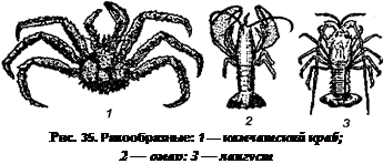Ракообразные (рис. 35) имеют очень вкусное и полезное мясо, в котором мало жира (до 2%), но много полноценного белка (15— 20%), витаминов группы В и микроэлементов (в десятки раз больше, чем в говядине). Тело ракообразных покрыто твердым панцирем, а мясо брюшка, шейки, клешней мягкое. К этой группе относятся крабы, креветки, раки, омары, лангусты.