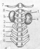 а: 1 — 6 — поперечнореберные отростки поясничных позвонков; 7,8 — ребра (перерезаны); а — левая почка; b — правая почка