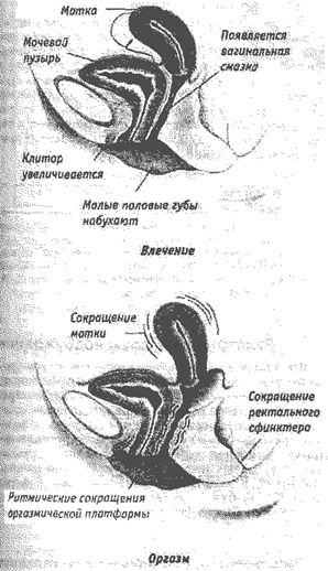 Рисунок 11.2. Нормальная структура женских половых органов во время совокупления. Во время каждой фазы цикла сексуального реагирования происходят изменения в гениталиях женщины. (Adapted from Hyde, 1990, p. 200.)